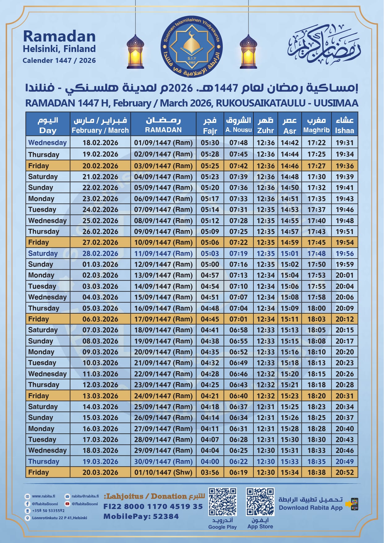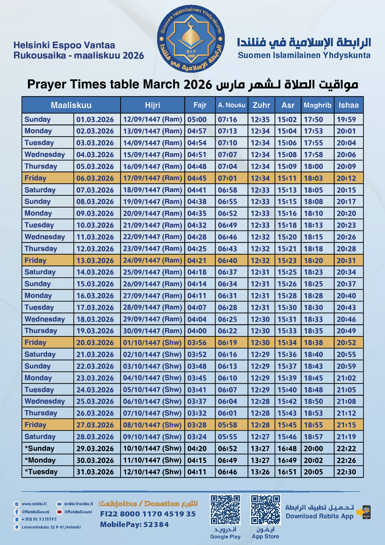 The school of the Islamic Association of Finland was established to provide educational services to Muslims living in Finland of various groups and ages. The school strives to teach the Holy Quran, the Arabic language and the principles of Islam in a moderate, balanced manner, which strengthens the sense of belonging to Islam and promotes a culture of love and peace by increasing awareness of the noble principles of Islam.....