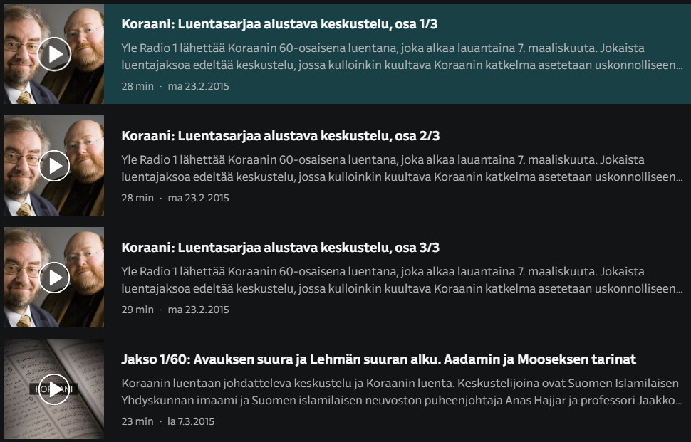 Koraani-sarja lähetettiin Yle Radio 1:ssä vuonna 2015.